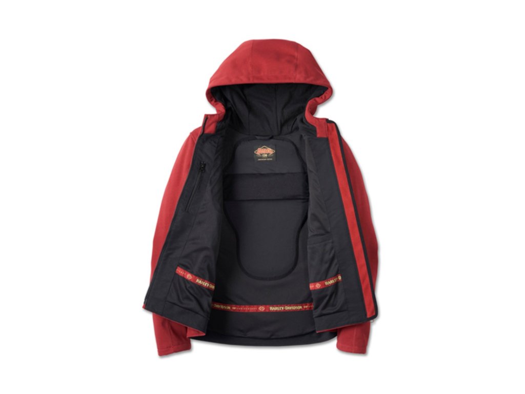 • Stay Cool: Obousměrné průduchy v podpaží a trupu pro proudění vzduchu. • Stay Warm: Větruodolné materiály a konstrukce. • Fit & Mobilita: Předem zakřivené rukávy. Nastavitelná kapuce. • Materiály: 66 % polyester, 34 % bavlna polar fleece. 100% polyesterová síťovaná podšívka. • Zapínání: Přední dvoucestný zip. • Kapsy: Kapsy na ruce na zip. Jedna vnitřní kapsa a jedna vnitřní kapsa na zip. • Další funkce: Obsahuje CE-certifikované chrániče D30 Ghost na ramenou a loktech (98104-22VR & 98103-22VR). Zádová kapsa na páteřák (zádový chránič D30 Viper 98105-22VR se prodává samostatně). Odolný proti oděru. Z reflexního materiálu 3M Scotchlite na zadním třmenu. • Designové detaily: Vlastní značkové kování ke 120. výročí, vnitřní lepení a štítky. • Grafika: tkaná nášivka 120th Anniversary. Přímá výšivka ke 120. výročí. • Certifikace: Určeno pro splnění EN 17092-4:2020