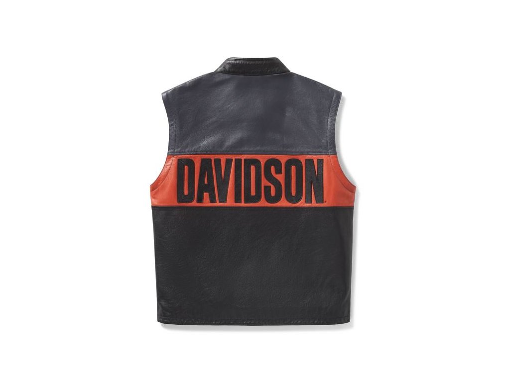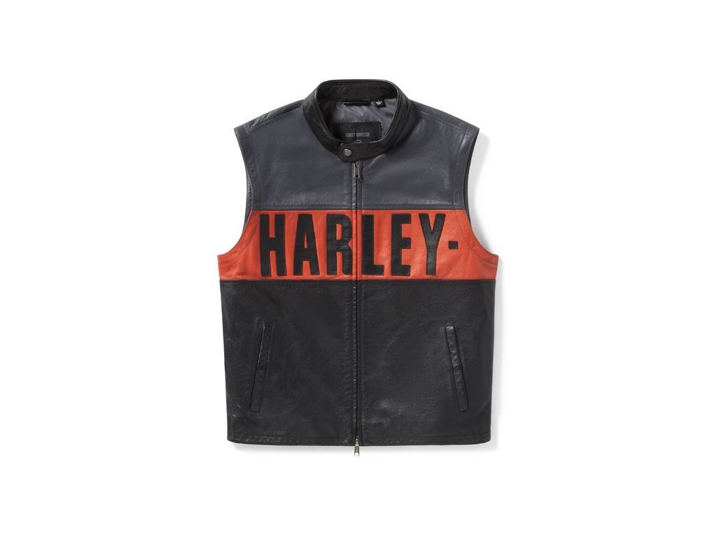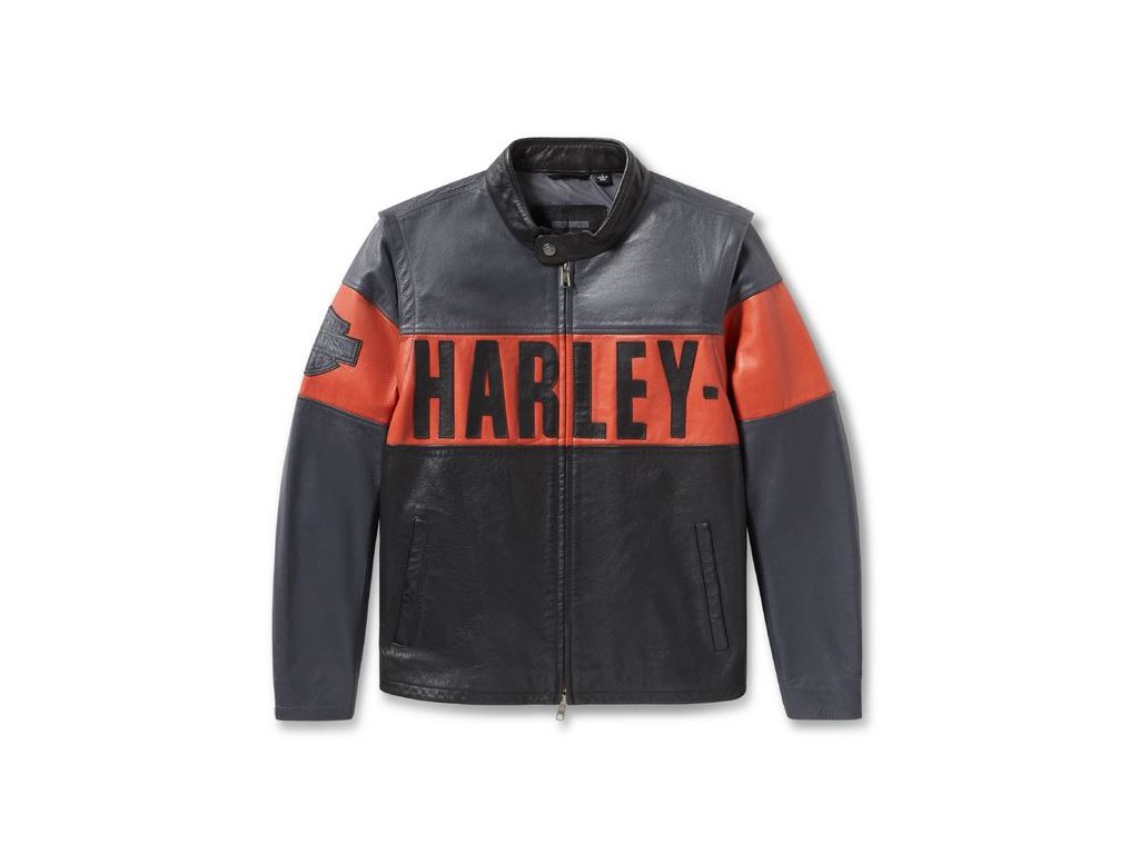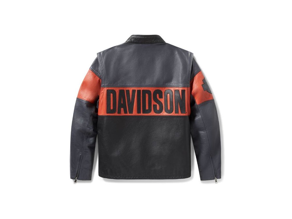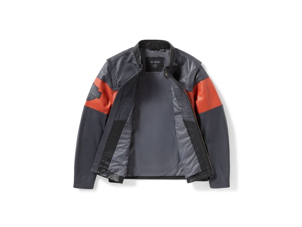 Odnímatelné rukávy na zip. Kontrastní kožené lemování a proužky. Polstrovaný límec s patentním uzávěrem.