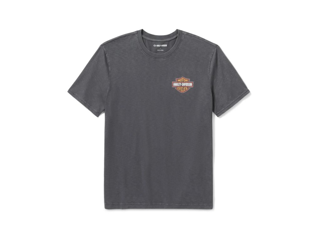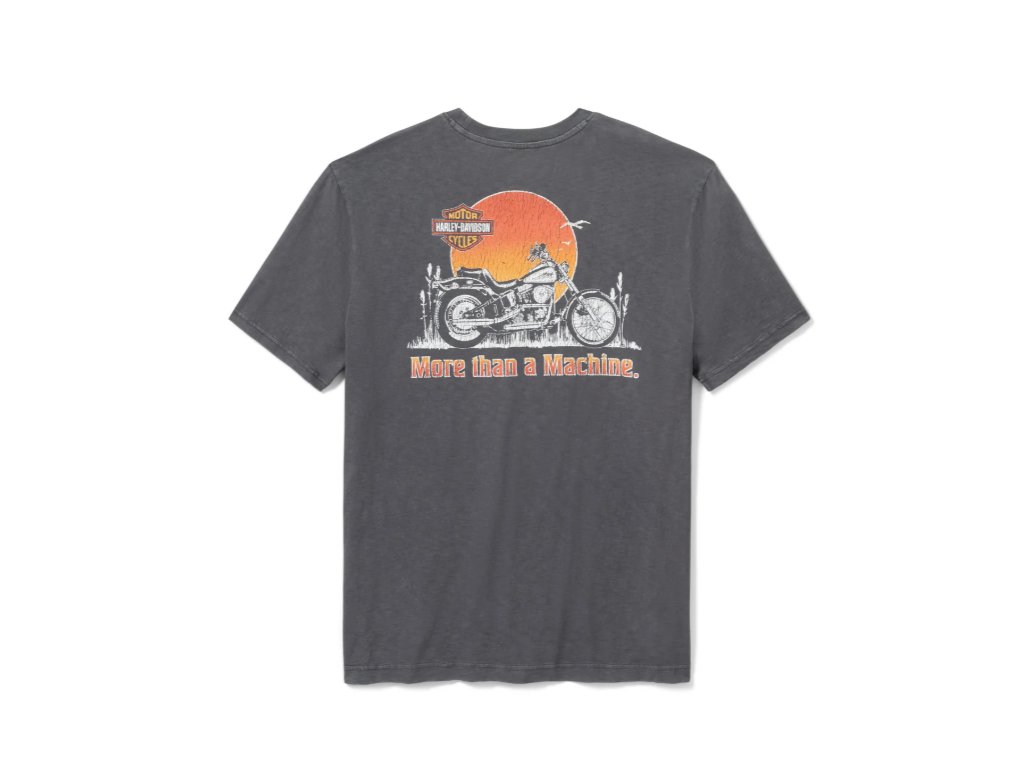 Naše tričko Softail Sunset se v retro stylu vrací k 80. letům. Je vyrobeno z velmi měkkého bavlněného žerzeje, který je barvený a praný s vintage efektem pro retro vzhled. Toto pánské tričko zdobí grafické díly s motivem našeho modelu FSXT Softail® z roku 1989 a slogan „Více než stroj“, který získal na popularitě po našem zpětném odkupu od společnosti AMF.