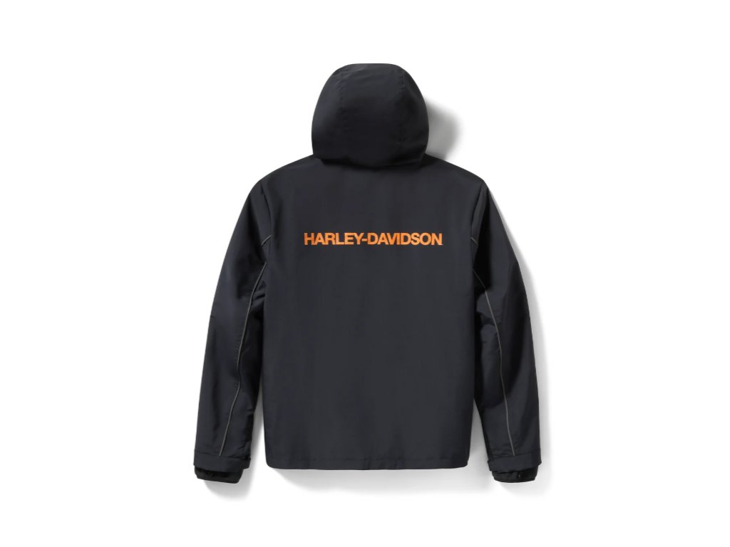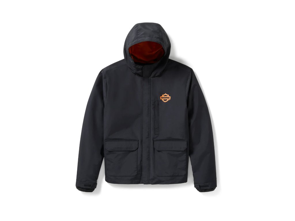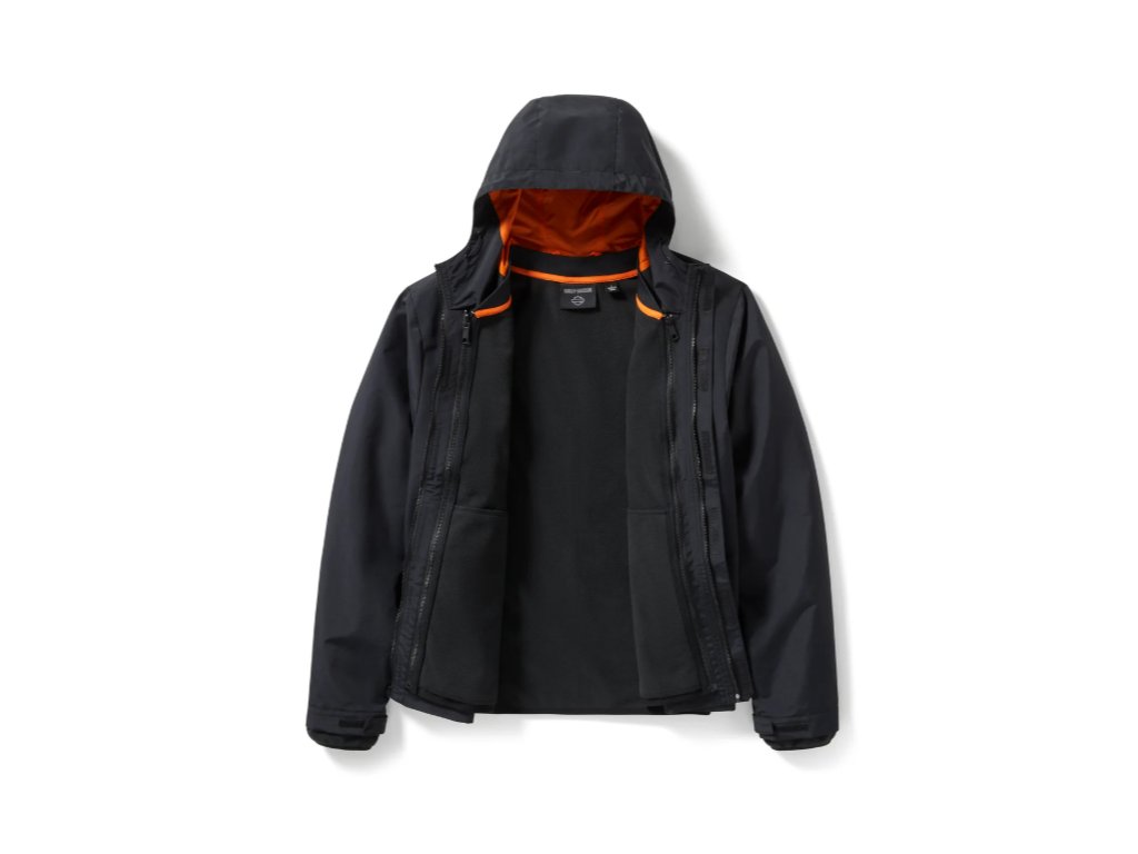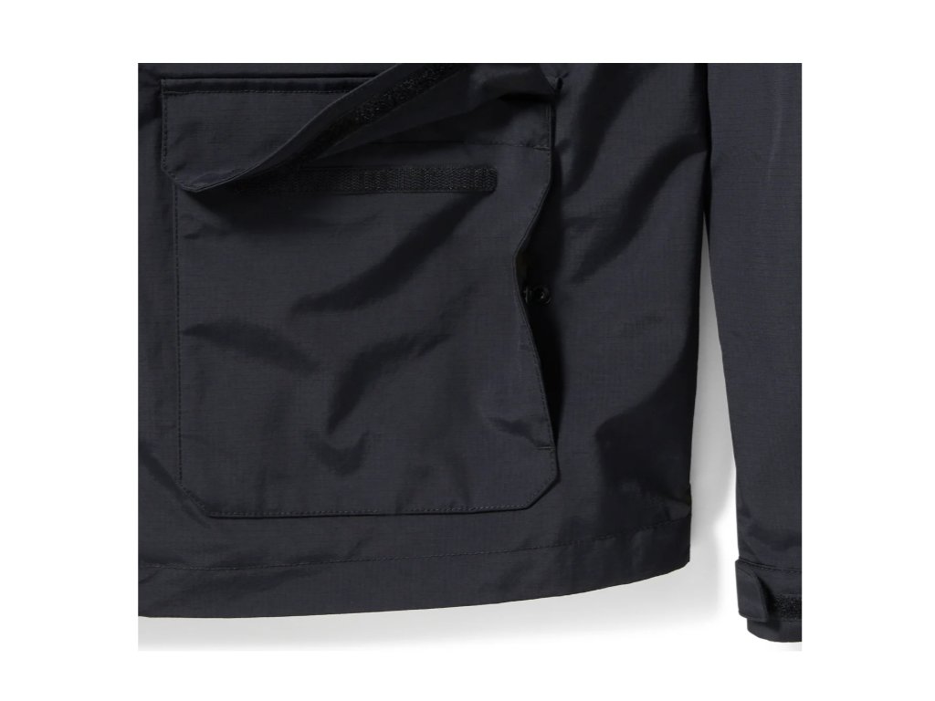Vnější bunda na zip má nepromokavé švy a kapuci se šňůrkou a kontrastní podšívku. Vnitřní bunda má rozdělený límec ve stylu mandarínky, žebrované manžety a lem a zapínání na patentky k vnější bundě.